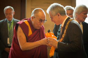 His Holiness the Dalai Lama presenting the Lord Mayor, Peter Feldmann, a Buddha statue during his visit to City Hall in Frankfurt, Germany on July 13, 2015. Photo/Manuel Bauer