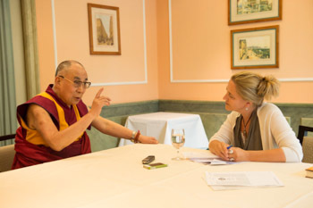 After lunch, Karin Steinberger, Features Editor of the Suddeutsche Zeitung, Germany's leading national newspaper interviewed His Holiness, principally about the prospects for his future reincarnation. He told her that he had completely retired from his political responsibilities, but retained his spiritual role. He spoke of how Tibetan settlements were established in India that allowed for the stable re-establishment of the great monasteries. As a result there are scholars who can take the religious tradition forward. He suggested that there are institutions that belong to the past feudal system that need to change. He pointed out that the institution of Dalai Lamas is not necessary for the preservation of the Tibetan Buddhist tradition. Laughing, he added that if he were to be the last Dalai Lama, at least the institution would end with someone who had a lot of friends.