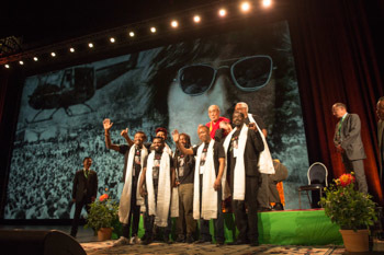 His Holiness the Dalai Lama with musicians from Senegal who performed at celebrations honoring his 80th birthday at the Jahrhunderthalle in Frankfurt, Germany on July 13, 2015. Photo/Manuel Bauer