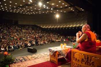 His Holiness the Dalai Lama speaking at celebrations honoring his 80th birthday at the Jahrhunderthalle in Frankfurt, Germany on July 13, 2015. Photo/Manuel Bauer