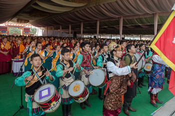 Tashi Lhunpo, Bylakuppe, Karnataka, India, 19 December 2015 - A grand inauguration ceremony was held this morning in full public view on the veranda of the new Tashi Lhunpo Assembly Hall. As His Holiness the Dalai Lama emerged into the sunshine, Tibetan opera dancers performed the Tashi Shölpa Long Life dance. Everyone stood as Tibetan Children’s Village Students played the Tibetan National Anthem.