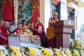 His Holiness the Dalai Lama speaking at the inauguration ceremony for the new Tashi Lhunpo Monastery Assembly Hall in Bylakuppe, Karnataka, India on December 19, 2015. Photo/Tenzin Choejor/OHHDL