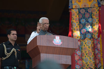 Governor of Karnataka Shri Vajubhai Rudabhai Vala speaking at the inauguration ceremony for the new Tashi Lhunpo Monastery Assembly Hall in Bylakuppe, Karnataka, India on December 19, 2015. Photo/Tenzin Choejor/OHHDL