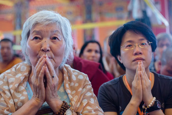 “Whenever we are engaged in giving or listening to a Dharma discourse we should have a pure motivation,” His Holiness began. “The teachings are not about showing off, but seeking to help others. We need to learn how to act in practice, not mixed with the eight worldly concerns. If our practice is to become a Dharma practice, it must be based on taking refuge in the Three Jewels, which involves more than installing or paying respect to sacred images. Our minds should be tamed. When we recite the verse for taking refuge and generating the awakening mind, we need to take refuge in the Buddha, Dharma and Sangha, remembering that the Buddhas don’t wash beings' unwholesome deeds away with water, nor do they remove their sufferings with their hands. Their kindness is to reveal reality and the path to liberation.