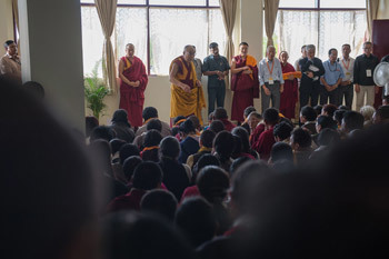 Tashi Lhunpo, Bylakuppe, Karnataka, India, 23 December 2015 - Golden early morning sunlight suffused the land around Tashi Lhunpo Monastery today as His Holiness the Dalai Lama met more than 270 Tibetan pilgrims prior to beginning the day’s Lam Rim Teachings. He told them: