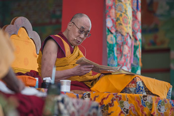 His Holiness the Dalai Lama reading the text during the Jangchub Lam Rim Teaching at Tashi Lhunpo Monastery in Bylakuppe, Karnataka, India on December 23, 2015. Photo/Tenzin Choejor/OHHDL