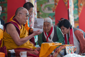 Tashi Lhunpo, Bylakuppe, Karnataka, India, 25 December 2015 - Events on the Tashi Lhunpo Monastery veranda began this morning with His Holiness the Dalai Lama’s launching the autobiography of Jampa Kalden, who died on this day three years ago. Born in Chamdo in 1923, Jampa Kalden joined the Chushi Gangdrug resistance in the 1950s. In exile he worked principally in the Department Security until he retired in 1987. His Holiness said Jampa Kalden’s family had asked him to launch the book, which is published in Tibetan by the Library of Tibetan Works & Archives, and he was glad to do so in the presence of his wife and daughter.