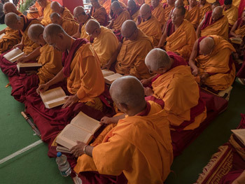 Senior monastics following the text during His Holiness the Dalai Lama's Lam Rim Teaching at Tashi Lhunpo Monastery in Bylakuppe, Karnataka, India on December 25, 2015. Photo/Tenzin Choejor/OHHDL