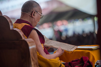 His Holiness the Dalai Lama reading from a text in printed in the traditional style during his Lam Rim Teaching at Tashi Lhunpo Monastery in Bylakuppe, Karnataka, India on December 25, 2015. Photo/Tenzin Choejor/OHHDL