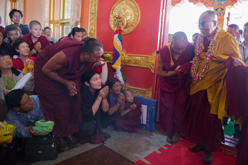 Members of the audience inside the temple convey their respect and warm wishes for His Holiness the Dalai Lama as he leaves the teaching ground at Tashi Lhunpo Monastery in Bylakuppe, Karnataka, India on December 25, 2015. Photo/Tenzin Choejor/OHHDL