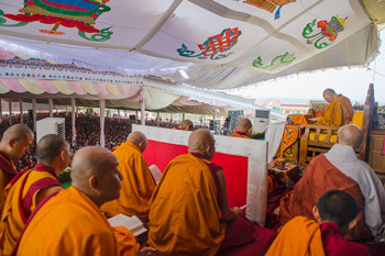 | His Holiness the Dalai Lama teaching from the