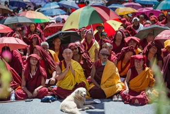 Leh, Ladakh, J&K, India, 30 July 2015 - The early morning air was fresh and low light illuminated the distant peaks as His Holiness the Dalai Lama set off from Spituk Monastery today. He and thousands of others was headed for the Shiwatsel teaching ground on the other side of the Leh valley. On arrival he greeted the Lamas, dignitaries and guests and took his seat on the throne to prepare for the White Tara empowerment. Down at the front of the platform monks engaged in vigorous debate.
