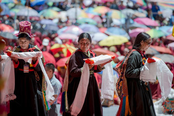 Members of the local community carrying offerings during the Long Life Offering ceremony for His Holiness the Dalai Lama at the Shiwatsel teaching ground in Leh, Ladakh, J&K, India on July 30, 2015. Photo/Tenzin Chojeor/OHHDL