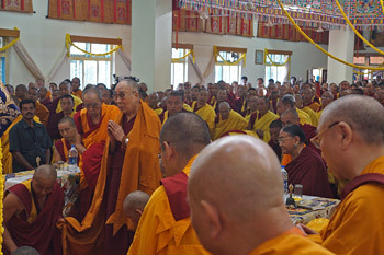 His Holiness the Dalai Lama speaking at Gyumey Tantric College temple in Hunsur, Karnataka, India on December 13, 2015. Photo/Jeremy Russell/OHHDL