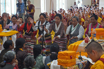 The Gyumey Chant Master led the Long Life Offering. The Abbot recited the eulogy and requests. Expressing the Tibetan people’s gratitude for His Holiness’s leadership and pledging to listen to his advice as a child heeds his or her mother, he requested him to live forever. A long line of local people processed through the temple bearing offerings. His Holiness responded:
