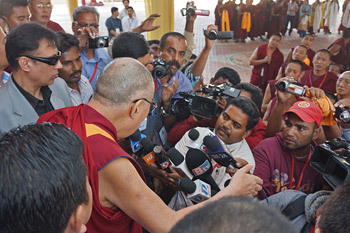 His Holiness the Dalai Lama answering questions from journalists on his arrival at the Sera Lachi Monastery in Bylakuppe, Karnataka, India on December 13, 2015.