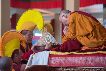 Bylakuppe, Karnataka, India, 18 December 2015 - The rumble of long horns early this morning heralded the concluding event of His Holiness the Dalai Lama’s stay at Sera Monastery in Bylakuppe; a Long Life Offering. It was conducted according to Sutrayana prayers, the Prayer to the Sixteen Arhats, Long Life Prayers to Amitayus, and dedication from the Samantabhadra prayer.