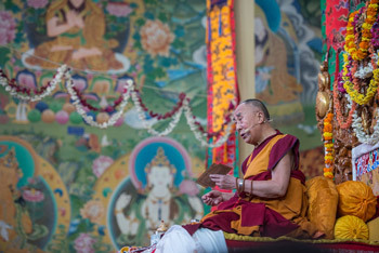 His Holiness the Dalai Lama teaching at Sera Lachi Temple at Sera Monastery in Bylakuppe, Karnataka, India on December 18, 2015. Photo/Tenzin Choejor/OHHDL