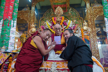 His Holiness the Dalai Lama releasing a digital Tibetan dictionary produced by Geshe Lobsang Monlam at Sera Monastery in Bylakuppe, Karnataka, India on December 18, 2015. Photo/Tenzin Choejor/OHHDL