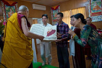 Theckchen Chöling, Dharamsala, HP, India, 15 May 2015 - His Holiness the Dalai Lama met with a group of 112 Vietnamese from the Vietnam CEO Club at his residence today. The group consists of about 60% women and 40% men. Most were in Dharamsala for the first time. To begin with the visitors offered His Holiness two large volumes containing Shantideva’s ‘Guide to the Bodhisattva’s Way of Life’ one in English and the other in Vietnamese. They were the work of 600 contributors. In his acknowledgement, His Holiness said: