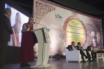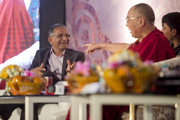 His Holiness referred to the wisdom to be found in ancient Indian knowledge. On the one hand he cited the great Indian physicist Raja Ramanna’s telling him of his excitement and pride in finding ideas in the writings of Nagarjuna that pre-empted the contemporary findings of quantum physics. On the other, His Holiness extolled the wealth of knowledge about the workings of our mind and emotions in ancient Indian psychology, knowledge that can be of great value today. He also praised India’s centuries’ old traditions of ahimsa, non-violence, and secularism.