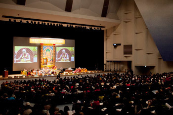 Tokyo, Japan, 13 April 2015 - The Showa Joshi Women’s University Memorial Hall was empty this morning when His Holiness the Dalai Lama arrived. He took a seat facing the small pavilion containing the mandala and a thangka of 1000 armed Avalokiteshvara to begin preparations for the empowerment he was to give. During the hour that these took the hall steadily filled.