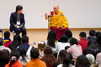 His Holiness the Dalai Lama during the afternoon session of his teachings at Showa Joshi Women’s University in Tokyo, Japan on April 13, 2015. Photo/Tenzin Jigmey