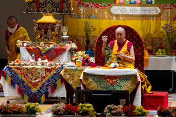 His Holiness began the afternoon session by giving a permission of Avalokiteshvara Khasarpani, a one faced two armed form, depicted at ease, resting in the nature of the mind. He then gave a concise reading of the middle volume of the ‘Stages of Meditation’, touching on several of the topics it discusses, such as what the mind is and how to train it. Compassion, which is the catalyst that activates the awakening mind of bodhichitta, is based on the recognition that although sentient beings don’t want suffering, they continually create its causes.