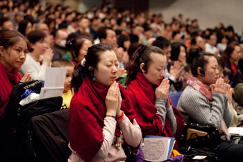 During the lunch break His Holiness met with a group of Chinese Buddhists. He told them that since there are estimated to be 400 million Buddhists in China, it is a Buddhist country. He recalled the many temples he saw during his visit in 1954-55. He remarked that the communist authorities have tried to eradicate religion and failed. Religion is a source of solace and while many religious traditions are rooted in faith, what stands out about Buddhism is its use of reasoning.