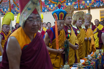 At 8 o’clock His Holiness was escorted from the gates of his residence up to the Tsuglagkhang, where he greeted the assembled guests and took his seat on the throne. Seated before him on a line of thrones were the leaders of the Tibetan spiritual traditions: to the right, Sakya Daktri Rinpoche, Menri Khen Rinpoche, Gyalwang Karmapa, Drikung Chetsang Rinpoche, Taglung Shabdrung Rinpoche, and to the left Ganden Tri Rinpoche, Katok Getse Rinpoche and a representative of the Drukchen Rinpoche. Behind them sat abbots and retired abbots of the great monasteries.