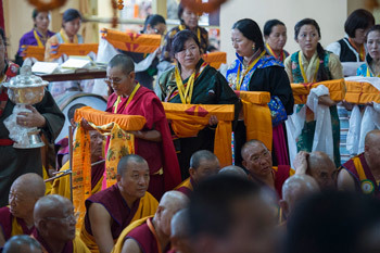 Several prayers, among them Praises to the Buddha, the ‘Invocation of the Seventeen Sagacious Adepts of Glorious Nalanda’ and an invocation of the Series of Reincarnations of the Dalai Lamas, preceded the Long-Life Offering. This was presented by the Central Tibetan Administration, the Domay Community and the Gelug International Foundation and presided over by Sakya Daktri Rinpoche. During the ceremony the Tse-ring Che-nga and Nechung Oracles appeared separately in trance. They each paid their respects to His Holiness and gathered spiritual and political leaders together in front of him to say prayers. Sakya Dagtri proclaimed the long Eulogy and Request to live long in conjunction with the offering of the mandala of the universe. He, the Sikyong and the Speaker of the Assembly of Tibetan People’s Deputies together offered the mandala to His Holiness. Symbolic offerings of the 8 Auspicious Symbols, the 7 Emblems of Royalty and the 8 Auspicious Substances were presented, while a procession of other offerings was carried through the temple.