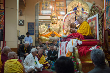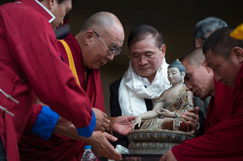 The Chief Minister of Arunachal Pradesh, the Hon. Nabam Tuki, presenting His Holiness the Dalai Lama with a Buddha statue during celebrations honoring his 80th birthday at the Main Tibetan Temple in Dharamsala, HP, India on June 21, 2015. Photo/Tenzin Choejor/OHHDL