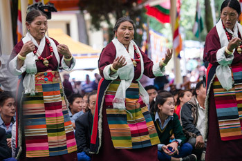Tibetan women performing traditional song and dance during celebrations honoring His Holiness the Dalai Lama's 80th birthday at the Main Tibetan Temple in Dharamsala, HP, India on June 21, 2015. Photo/Tenzin Choejor/OHHDL