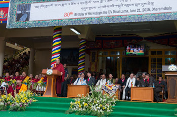 His Holiness the Dalai Lama speaking during celebrations honoring his 80th birthday at the Main Tibetan Temple in Dharamsala, HP, India on June 21, 2015.