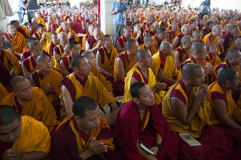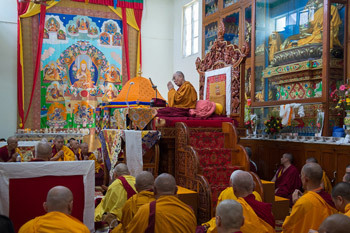 Verses of homage to the Buddha, the Heart of Wisdom Sutra, and the mandala offering were recited, followed by the Praise to the 17 Masters of Nalanda and the Praise to Jetsun Sherab Sengey, founder of the tantric college. Recitations complete, His Holiness began to address the gathering.