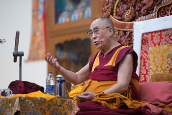 His Holiness the Dalai Lama speaking during the first day of his teachings at Gyumey Tantric College in Hunsur, Karnataka, India on December 9, 2015. Photo/Tenzin Choejor/OHHDL