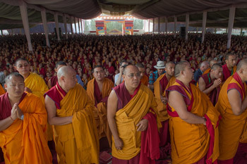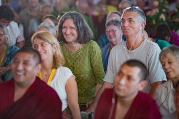 His Holiness paused to ask for a show of hands from members of the audience to show who was attending these teachings for the first time. A few hands went up.