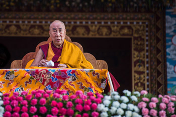 His Holiness the Dalai Lama speaking during the first session of the resumption of the Jangchub Lam Rim teaching at Tashi Lhunpo Monastery in Bylakuppe, Karnataka, India on December 20, 2015. Photo/Tenzin Choejor/OHHDL