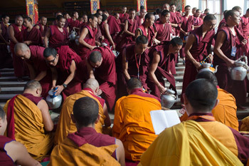 “As I said the other day,” His Holiness remarked, “we don’t say these prayers just to clear our throats, but to make the occasion meaningful. So now we’ll recite the prayer for taking refuge and generating the awakening mind. When the Buddha appeared in India 2600 years ago, according to the Theravada tradition, he was compassionate and skilful. What he taught then has become an important tradition and he is regarded as a significant teacher, a teacher of non-violence. These days, people who adopt a curious, sceptical stance take interest in what the Buddha taught.