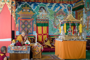His Holiness the Dalai Lama performing preparatory rituals before the second day of the Sixteen Drops of Kadam Empowerment at Tashi Lhunpo Monastery in Bylakuppe, Karnataka, India on December 31, 2015.