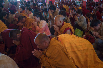 Members of the audience taking part in the Sixteen Drops of Kadam Empowerment at Tashi Lhunpo Monastery in Bylakuppe, Karnataka, India on December 31, 2015.