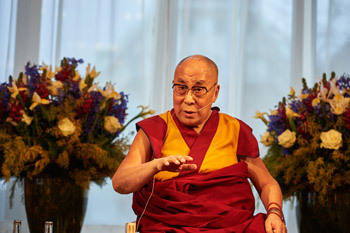 The first question from the floor was a simple “How are you?” and His Holiness replied that yesterday, when he arrived, he was tired. However, after going to bed at 5.30pm and getting up again at 2.30am he felt refreshed. Asked what needs to change in education today he remarked that the existing education system is focused on materialistic goals with insufficient attention to inner values. What is needed, he said, is a curriculum that incorporates such human values in a way that is universally acceptable. He mentioned meeting with members of the Mind & Life Institute a few days ago to hear about progress on just such a program called ‘Call to Care’.