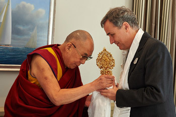 His Holiness the Dalai Lama presenting the President of Basel City Canton, Dr Guy Morin, with a gift during his meeting with members of the local City-Canton Government in Basel, Switzerland on February 7, 2015. Photo/Olivier Adam
