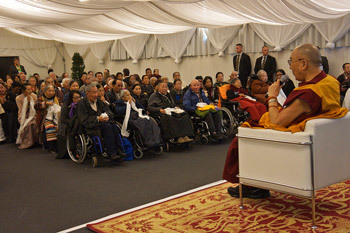 As he was leaving the building, His Holiness held a short meeting with about 200 elderly and frail Tibetans. He told them that since they had spent their lives trying not to harm others and trying to develop the awakening mind of bodhichitta, as he himself does every day, they should relax and feel at ease. In the light of the empowerment he will give tomorrow, he commented that Tibetans have a special connection with Avalokiteshvara. He added that although Tibetans tended to squabble among themselves when Tibet was free, now the difficulties they have faced has brought about a firm unity.
