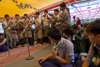 Dharamsala, HP, India, 27 May 2015 - His Holiness the Dalai Lama was given a traditional Tibetan welcome when he arrived at the Upper Tibetan Children’s Village School this morning. A large group of female students sang a traditional welcoming song. As His Holiness walked from his car to the stage he greeted people in the crowd who caught his eye. Approximately 4500 students from Upper and Lower TCV Schools, Gopalpur, Suja and Chauntra TCVs, Sherab Gatsel Lobling, students at various universities and others currently attending a Teacher Training organized by the Education Department of the CTA, were seated under an awning on the Upper TCV basketball court.