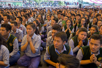 “Today, people from a variety of places have gathered here to listen to an introduction to Buddhism,” His Holiness began. “This is the ninth occasion that we’ve done this and it looks like this might be the biggest yet. Students and teachers from different schools, my greetings to you all - Tashi delek. I’d especially like to greet those who have just debated in front of us and congratulate them for taking an interest in logic and philosophy.