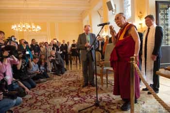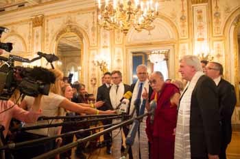 His Holiness the Dalai Lama speaking to members of the press after his meeting with Hesse Parliamentarians at the Hesse Parliament building in Wiesbaden, Hesse, Germany on July 14, 2015. Photo/Manuel Bauer