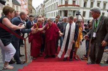 Wiesbaden, Hesse, Germany, 14 July 2015 - This morning, before leaving for India, His Holiness the Dalai Lama was invited to the Wiesbaden City Hall and the Hesse Parliament. He was met at the foot of the steps to the City Hall by Mayor Arno Grossman, who escorted him inside.