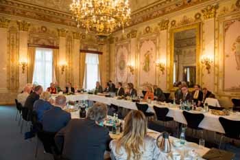 His Holiness the Dalai Lama speaking with Hesse Parliamentarians at the Hesse Parliament building in Wiesbaden, Hesse, Germany on July 14, 2015. Photo/Manuel Bauer