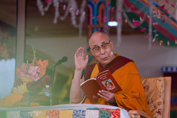 His Holiness the Dalai Lama reading from ‘A Guide to the Bodhisattva's Way of Life’ during his teachings in Leh, Ladakh, J&K, India on August 19, 2016. Photo/Tenzin Choejor/OHHDL